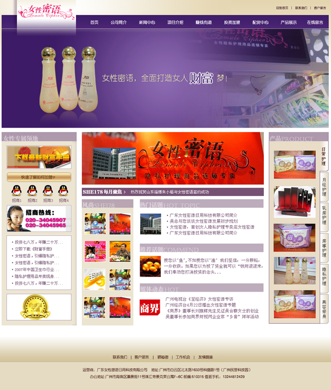 項目名稱:廣東女性密語日用科技有限公司網站改版簽定日期:2009年9月7日舊版網址:www.she178.com廣東女性密語日用科技有限公司是一家大型的集日用科技開發銷售于一體的民營高科技企業。公司擁有十余年的女性日用健康產品的研究與生產經