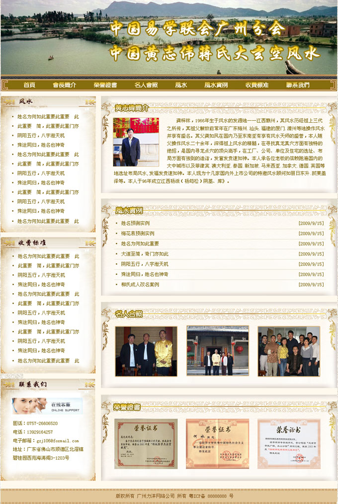 項目名稱:黃志偉風水大師網站建設協議(易學聯會廣州分會)簽定日期:2009年10月13日首頁效果: