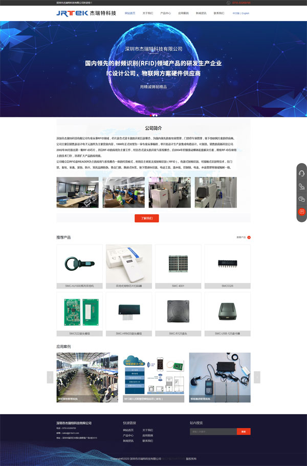 項(xiàng)目名稱:深圳市杰瑞特科技有限公司建設(shè)網(wǎng)站 設(shè)計(jì)稿: 深圳市杰瑞特科技有限公司專業(yè)從事RFID領(lǐng)域,芯片及各式讀卡器的開(kāi)發(fā)以及整合,為國(guó)內(nèi)領(lǐng)先的畜牧業(yè)管理,門(mén)禁停車(chē)場(chǎng)管理,地下物聯(lián)網(wǎng)方案的供應(yīng)商。公司主要以銷(xiāo)售及設(shè)計(jì)電子元器件為主要營(yíng)