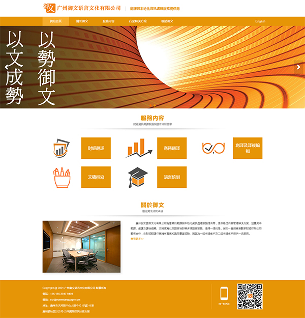 項目名稱:廣州御文語言文化有限公司建網站 項目網址:www.yuwenlanguage.com 公司簡介: 廣州御文語言文化有限公司為專業的翻譯與本地化資訊處理服務提供商,提供最佳內容管理解決方案,涵蓋英中翻譯、創譯及譯後編輯、文稿