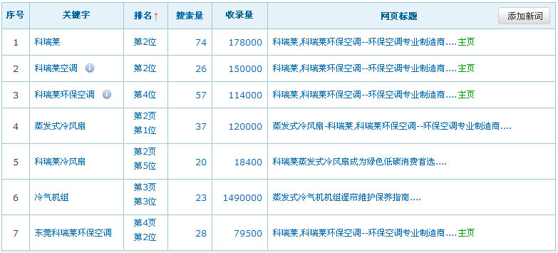 網站名稱:科瑞萊環保空調網站網址:http://www.keruilaizd.com/關鍵詞:科瑞萊,科瑞萊環??照{,科瑞萊空調服務類型:收費(2500元)關鍵詞在百度排名數據: