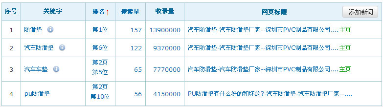 網站名稱:深圳市鼎揚塑膠制品有限公司網址:http://www.dydynx.com/關鍵詞:防滑墊、汽車防滑墊服務類型:收費(2500元/年)關鍵詞在百度排名數據:(暫時只列出百度的排名數據,其它搜索引擎的排名效果暫不列出)