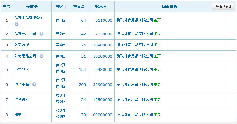 網(wǎng)站名稱:騰飛體育用品有限公司網(wǎng)址:http://www.tf-sports.com關(guān)鍵詞:體育器械、體育用品有限公司、體育器材公司、體育用品、體育設(shè)備服務(wù)類型:收費(2500元/年)關(guān)鍵詞在百度排名數(shù)據(jù):(暫時只列出百度的排名數(shù)據(jù),其它搜