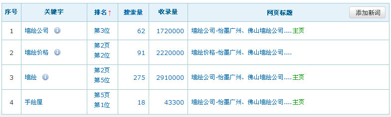 網站名稱:怡墨廣州、佛山墻繪公司網址:http://www.yimoqh.com/關鍵詞:墻繪公司、墻繪服務類型:收費(2000元/年)關鍵詞在百度排名數據:(暫時只列出百度的排名數據,其它搜索引擎的排名效果暫不列出)
