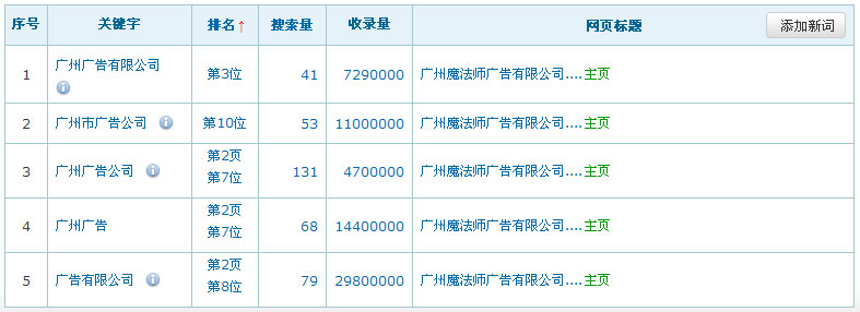 網站名稱:廣州魔法師廣告有限公司網址:http://www.gzmfs.com關鍵詞:廣州廣告有限公司、廣州廣告公司服務類型:收費(1000元/年)關鍵詞在百度排名數據:(暫時只列出百度的排名數據,其它搜索引擎的排名效果暫不列出)
