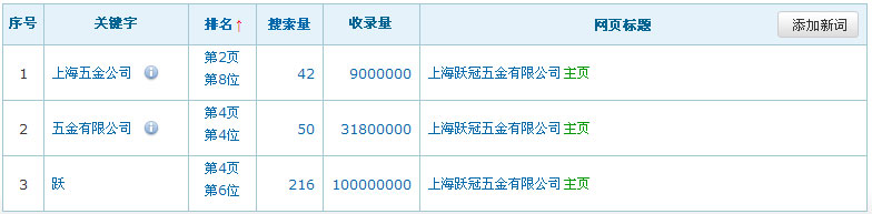 網站名稱:上海躍冠五金有限公司網址:http://www.yueguanwj.com/關鍵詞:上海五金公司服務類型:免費關鍵詞在百度排名數據:(暫時只列出百度的排名數據,其它搜索引擎的排名效果暫不列出)
