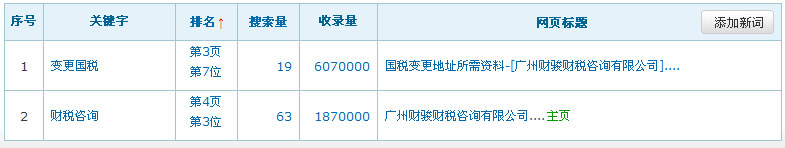 網站名稱:廣州財駿財稅咨詢有限公司網址:http://www.gzcaijun.com/關鍵詞:財稅咨詢服務類型:免費關鍵詞在百度排名數據:(暫時只列出百度的排名數據,其它搜索引擎的排名效果暫不列出)