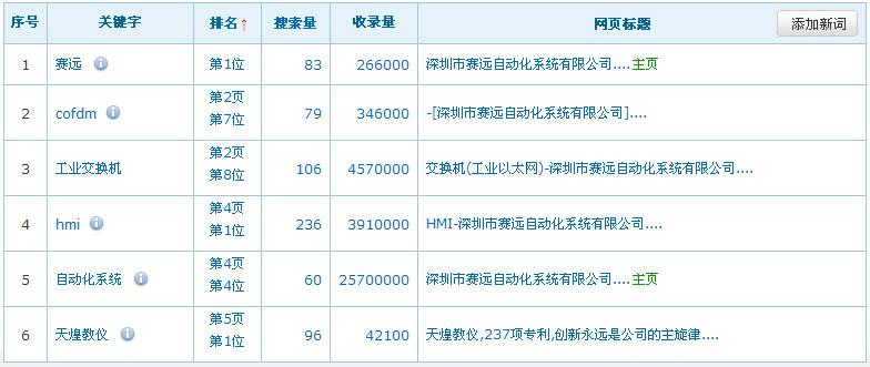 網站名稱:深圳市賽遠自動化系統有限公司網址:http://www.saiyuan.net關鍵詞:工業交換機、自動化系統服務類型:免費關鍵詞在百度排名數據:(暫時只列出百度的排名數據,其它搜索引擎的排名效果暫不列出)