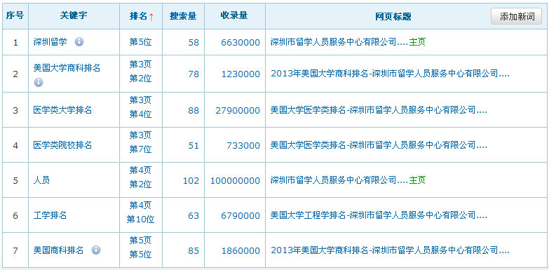 網(wǎng)站名稱(chēng):深圳市留學(xué)人員服務(wù)中心網(wǎng)址:http://www.scos.cn/關(guān)鍵詞:深圳留學(xué)服務(wù)類(lèi)型:收費(fèi)(1000元/年)關(guān)鍵詞在百度排名數(shù)據(jù):(暫時(shí)只列出百度的排名數(shù)據(jù),其它搜索引擎的排名效果暫不列出)