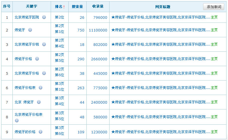 網站名稱:北京烤瓷牙醫院網址:http://www.kaociya-china.com關鍵詞:北京烤瓷牙醫院、烤瓷牙、烤瓷牙價格服務類型:收費(1500元/年)關鍵詞在百度排名數據:(暫時只列出百度的排名數據,其它搜索引擎的排名效果暫不列出