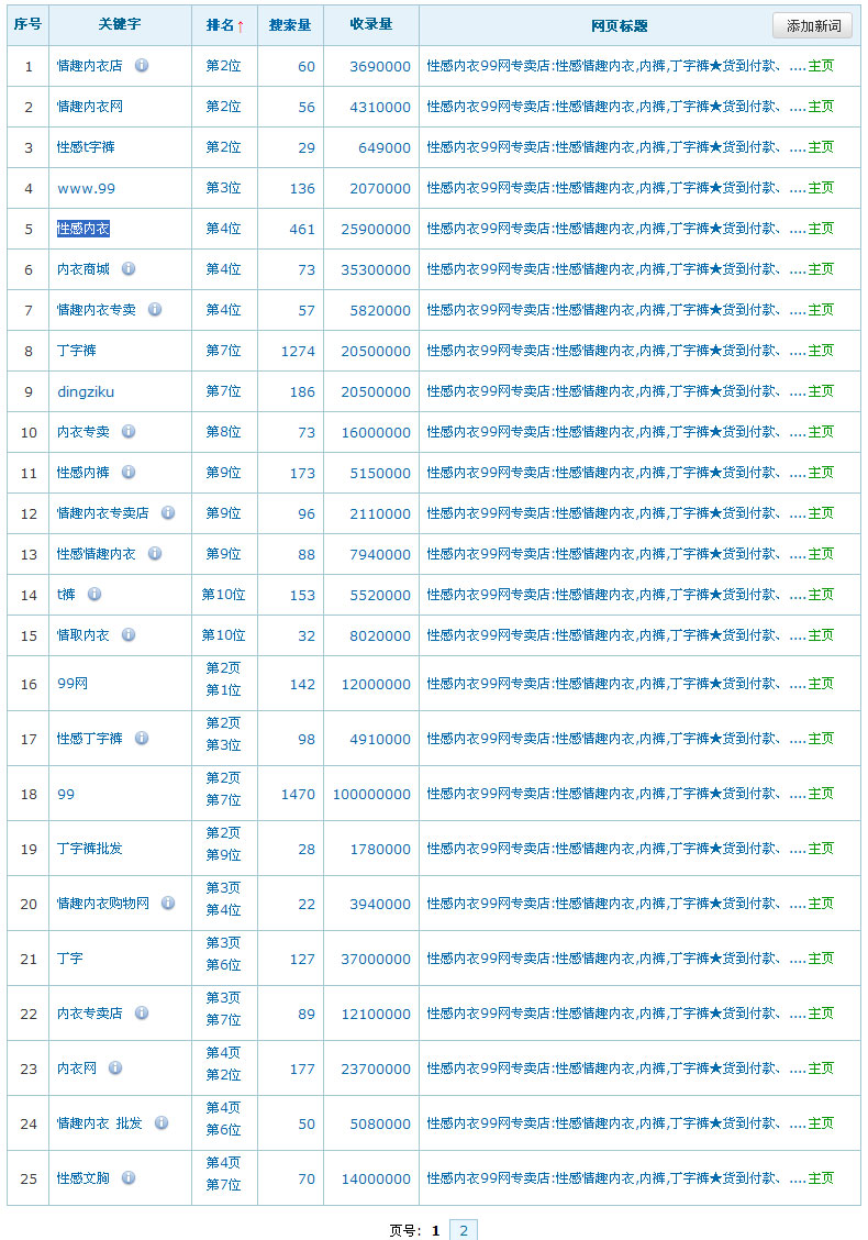 網站名稱:性感內衣網網址:http://www.guanghei.com/關鍵詞:情趣內衣、性感內衣、丁字褲、性感內褲服務類型:收費(5000元/年)關鍵詞在百度排名數據:(暫時只列出百度的排名數據,其它搜索引擎的排名效果暫不列出)